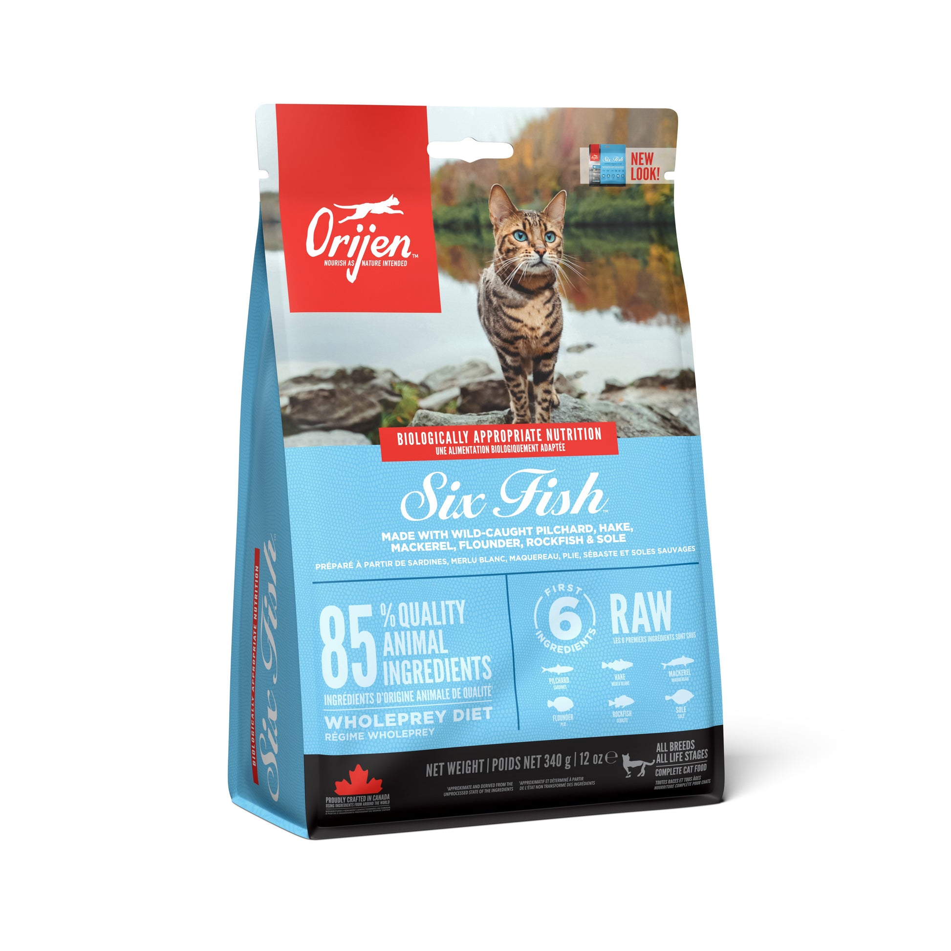生の丸ごとイワシ (28%), 生の丸ごとヘイク (7%), 生の丸ごとサバ (6%), 生カレイ(5%), 生の丸ごとメバル (5%), 生の丸ごとシタビラメ (5%), ディハイドレートサバ (5%), ディハイドレートニシン (5%), ディハイドレートアオギス (5%), ポロック油 (5%), ディハイドレート白身魚 (5%), ディハイドレートイワシ (4%), ヒマワリ油, 丸ごと赤レンズ豆, 丸ごと緑レンズ豆, 丸ごとエンドウ豆, レンズ豆繊維, 丸ごとヒヨコ豆, 丸ごとピント豆, エンドウ豆スターチ, 乾燥ケルプ, 新鮮丸ごとカボチャ, 新鮮丸ごとバターナッツスクワッシュ, 新鮮丸ごとズッキーニ, 新鮮丸ごとニンジン, 新鮮丸ごとリンゴ, 新鮮丸ごと洋梨, 乾燥チコリールート, 新鮮ケール, 新鮮ホウレン草, 新鮮ビートの葉, 新鮮カブラ菜, 丸ごとクランベリー, 丸ごとブルーベリー, 丸ごとサスカトゥーンベリー, ターメリック, オオアザミ, ゴボウ, ラベンダー, マシュマロルート, ローズヒップ 酸化防止剤: 植物油から抽出したトコフェロール: 121mg, クエン酸: 40mg, ローズマリーエキス: 80mg 添加栄養素(1kgあたり): 3a890 塩化コリン (コリン): 1190mg, 3b606 (亜鉛: 105mg), 3b406 (銅: 11mg), 3a821 ビタミンB1: 12.5mg, 3a825i ビタミンB2: 10mg, 3a314 ビタミンB3: 50mg, 3a841 ビタミンB5: 8mg, 3a831 ビタミンB6: 6.5mg, 3a316 ビタミンB9: 0.75mg, 3a880 ビタミンB7: 0.13mg, ビタミン B12: 0.1mg, 3a710 ビタミンK3: 0.5mg, 3a672a ビタミンA: 3750 IU, 3a671 ビタミンD3: 500 IU, 3a700 ビタミンE: 410 IU, 3a300 ビタミンC: 12.5 IU 添加腸球菌: 4b1707 エンテロコッカスフェシウム菌NCIMB 10415 1x10^9 CFU