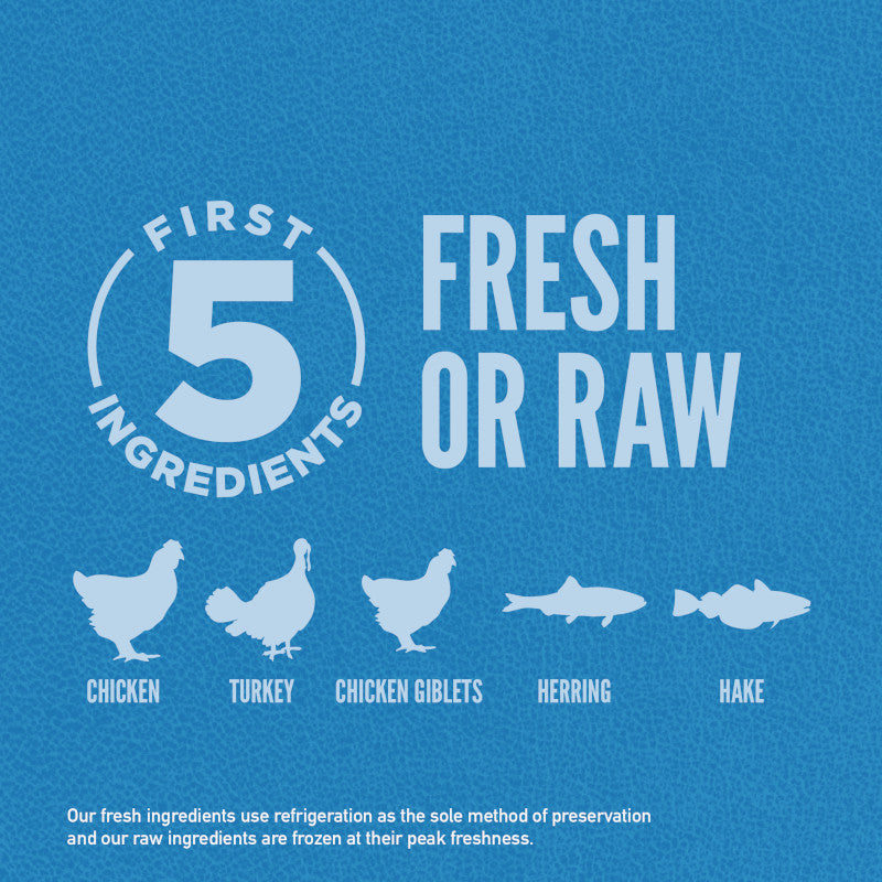 新鮮鶏肉 (25%), 生七面鳥肉 (8%), 新鮮鶏内臓 (レバー, 心臓) (7%), 生の丸ごとニシン (6%), 生の丸ごとヘイク (5%), 新鮮卵 (5%), 生七面鳥レバー (5%), ディハイドレート鶏肉 (4%), ディハイドレート七面鳥肉 (4%), ディハイドレートサバ (4%), ディハイドレートイワシ (4%), ディハイドレートニシン (4%), 丸ごと赤レンズ豆, 丸ごとヒヨコ豆, 丸ごとエンドウ豆, 鶏脂肪 (3%), 丸ごと緑レンズ豆, 丸ごとピント豆, 丸ごと白インゲン豆, レンズ豆繊維, ポロック油 (1%), エンドウ豆スターチ, 乾燥ケルプ, 新鮮丸ごとカボチャ, 新鮮丸ごとバターナッツスクワッシュ, 新鮮丸ごとズッキーニ, 新鮮丸ごとニンジン, 新鮮丸ごとリンゴ, 新鮮丸ごと洋梨, 乾燥チコリールート, 新鮮ケール, 新鮮ホウレン草, 新鮮ビートの葉, 新鮮カブラ菜, 丸ごとクランベリー, 丸ごとブルーベリー, 丸ごとサスカトゥーンベリー, ターメリック, オオアザミ, ゴボウ, ラベンダー, マシュマロルート, ローズヒップ 酸化防止剤: 植物油から抽出したトコフェロール: 121mg, クエン酸: 40mg, ローズマリーエキス: 80mg 添加栄養素 (1kgあたり): 3b606 (亜鉛: 105mg), 3b406 (銅: 11mg), 3a821 ビタミンB1: 10mg, 3a672a ビタミンA: 3750 IU, 3a671 ビタミンD3: 500 IU, 3a700 ビタミンE: 80 IU 添加腸球菌: 4b1707 エンテロコッカスフェシウム菌 NCIMB 10415 1x10^9 CFU