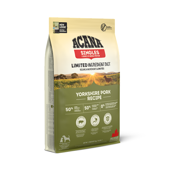 生豚肉 (18%), 豚ミール (18%), 丸ごとグリーンピース, 丸ごと赤レンズ豆, 生豚レバー (8%), 豚脂肪 (6%), 新鮮丸ごとバターナッツスクワッシュ (4%), 丸ごとヒヨコ豆, 丸ごと緑レンズ豆, 丸ごとイエローピース, レンズ豆繊維, エンドウ豆スターチ, 海藻 (EPAとDHAの供給源), 新鮮丸ごとカボチャ, 乾燥ケルプ, 塩, 丸ごとクランベリー, 丸ごとブルーベリー, 乾燥チコリールート, ターメリック, オオアザミ, ゴボウ, ラベンダー, マシュマロルート, ローズヒップ