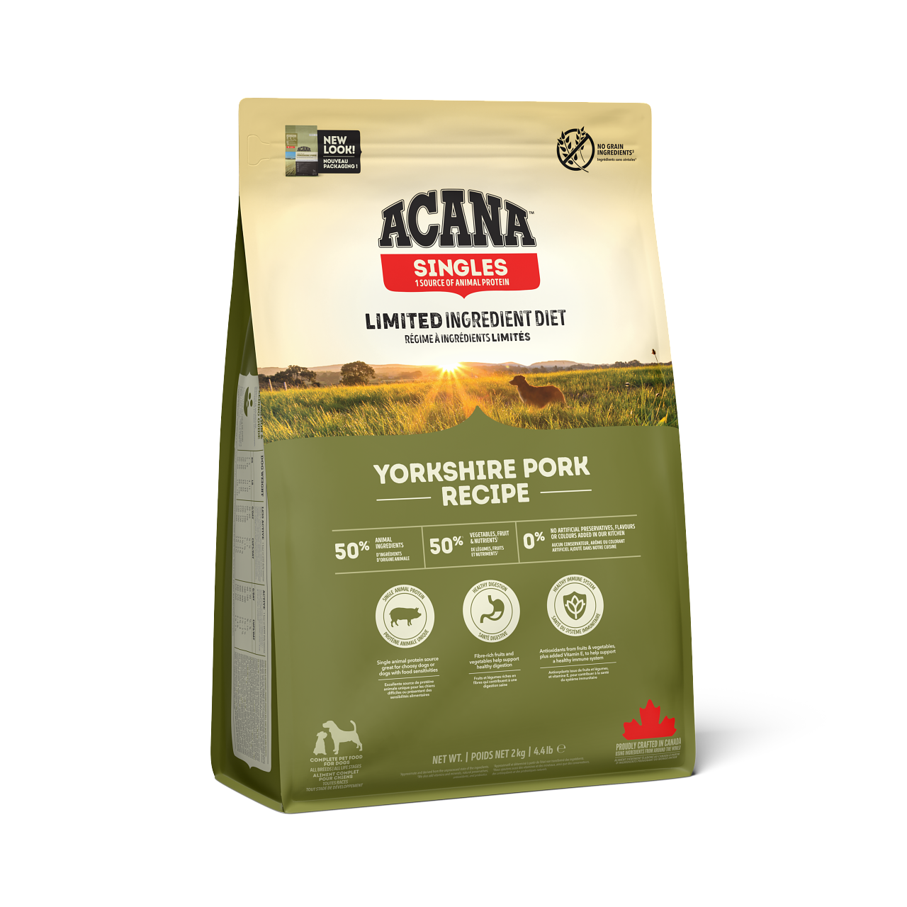 生豚肉 (18%), 豚ミール (18%), 丸ごとグリーンピース, 丸ごと赤レンズ豆, 生豚レバー (8%), 豚脂肪 (6%), 新鮮丸ごとバターナッツスクワッシュ (4%), 丸ごとヒヨコ豆, 丸ごと緑レンズ豆, 丸ごとイエローピース, レンズ豆繊維, エンドウ豆スターチ, 海藻 (EPAとDHAの供給源), 新鮮丸ごとカボチャ, 乾燥ケルプ, 塩, 丸ごとクランベリー, 丸ごとブルーベリー, 乾燥チコリールート, ターメリック, オオアザミ, ゴボウ, ラベンダー, マシュマロルート, ローズヒップ